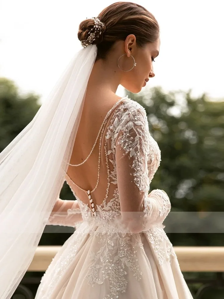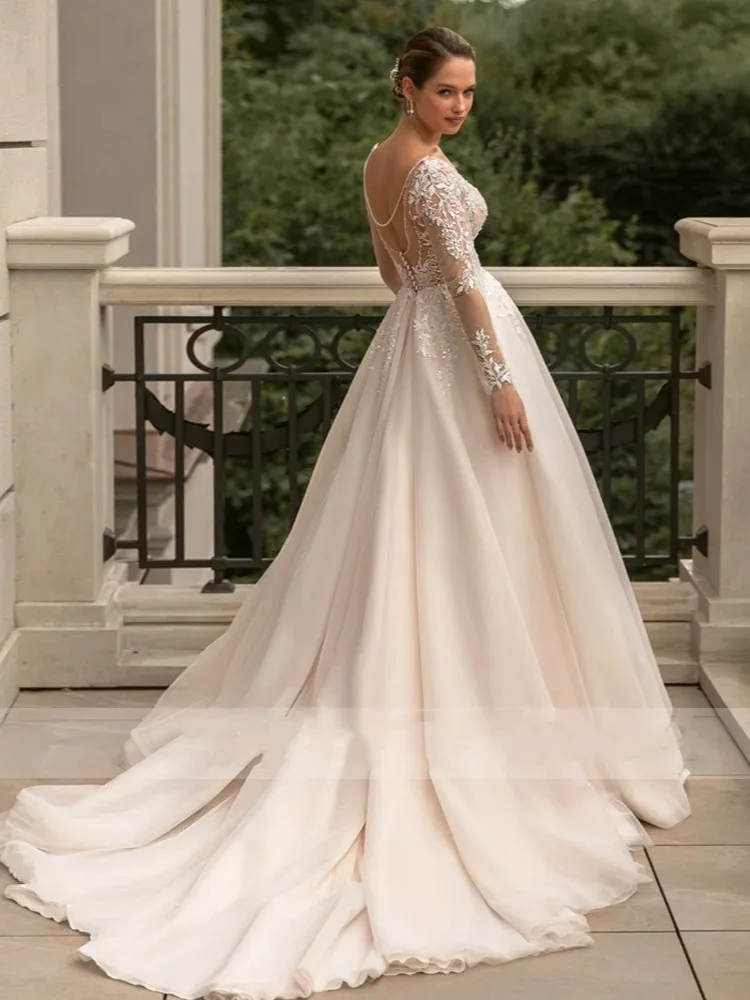 Boho V-neck Wedding Dresses Long Appliques Sleeves Lace Illusion Back Tulle Bridal Gowns Vestidos De Novia