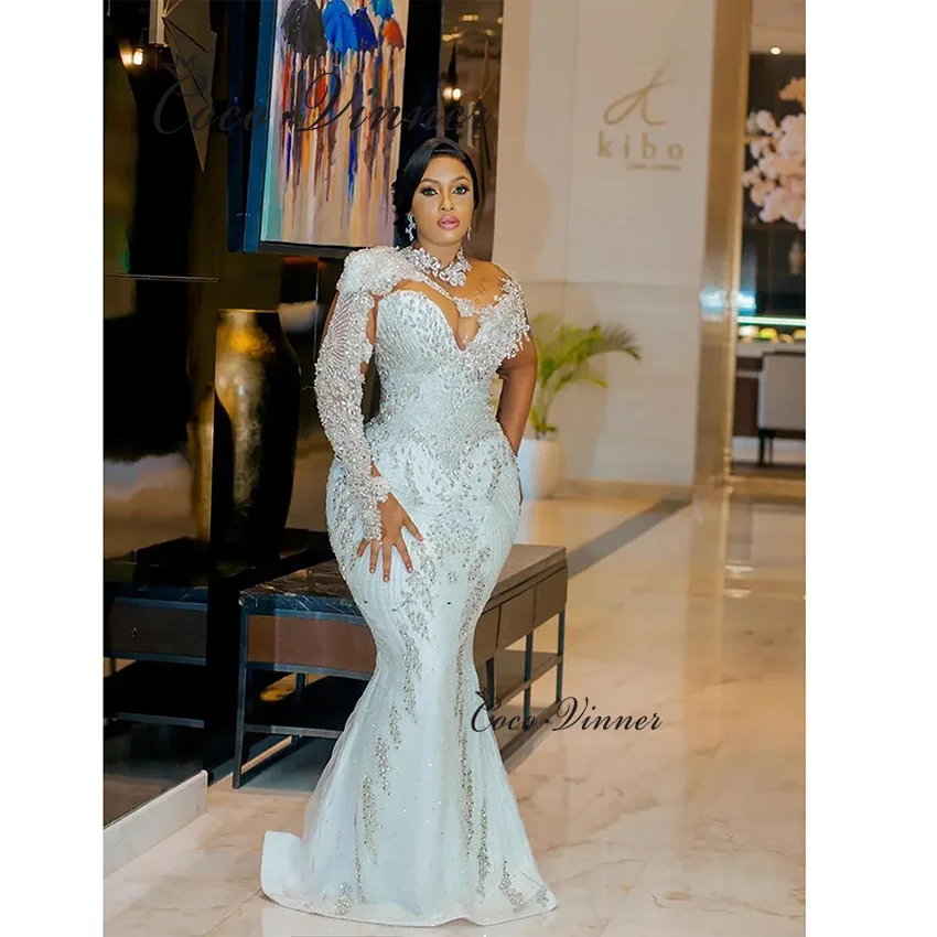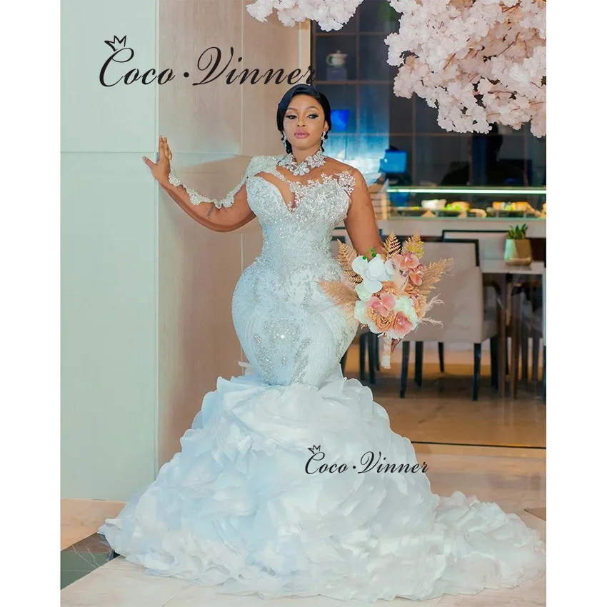 Customized High Neck Africa Luxury Mermaid Wedding Dresses 2025 Detachable Ruffle Train Beaded Lace Wedding Dress Women W1433