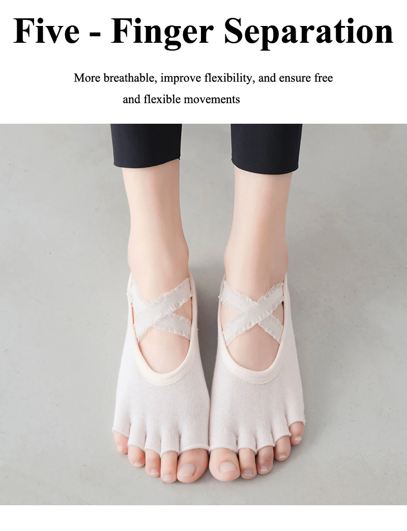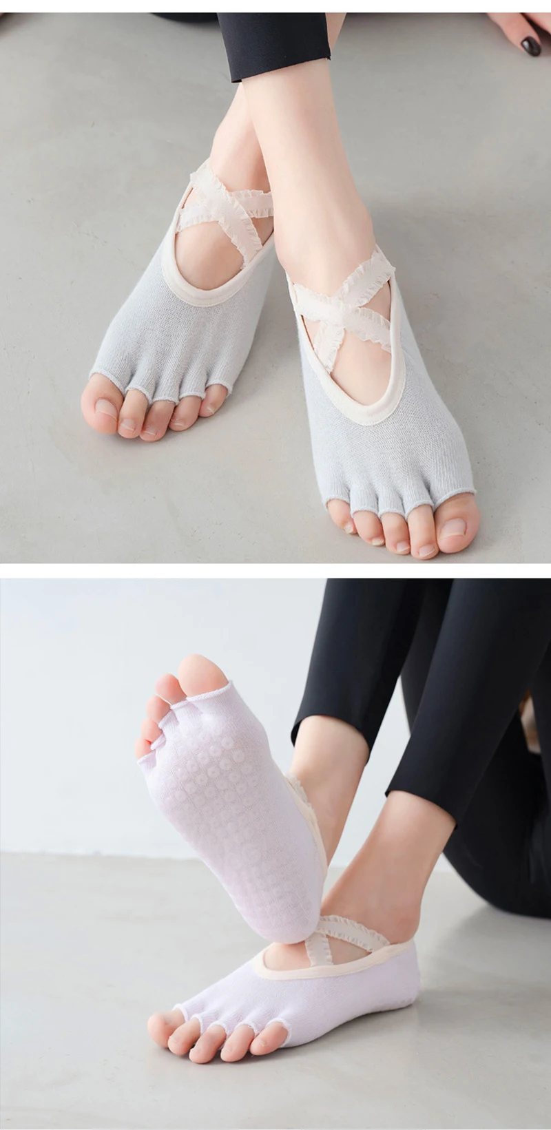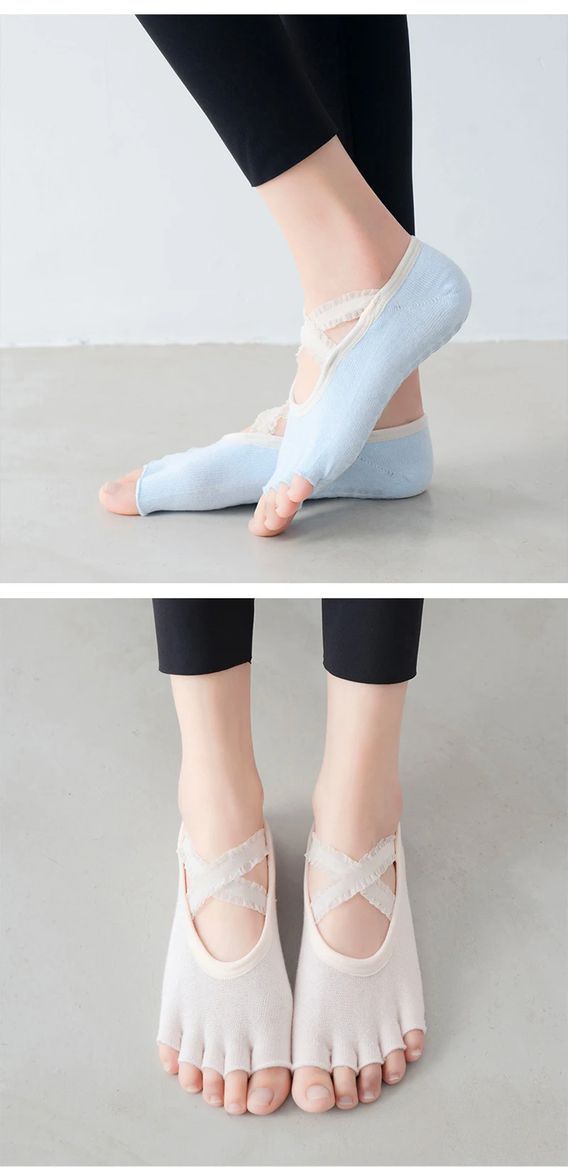 Five Finger Yoga Socks Lace Cross Strap Bandage Non Slip Gym Workout Pilates Ballet Dance Cotton Split Toe Grip Floor Socks
