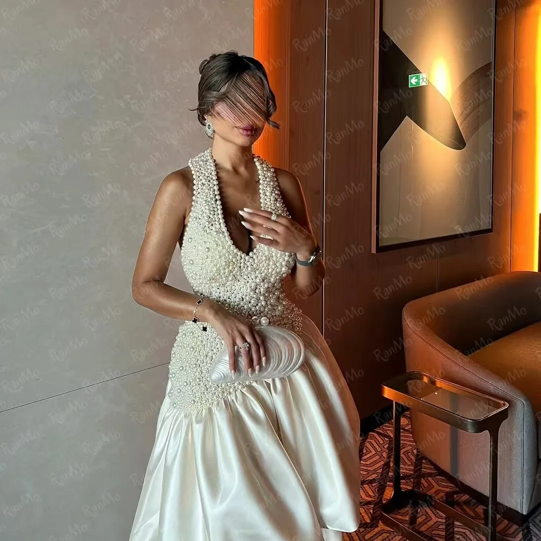 Ranmo Customized Luxury Sleeveless Halter Prom Dresses V-Neck Pearls Prom Dresses V Neck Pearls Backless Evening Party Dresses