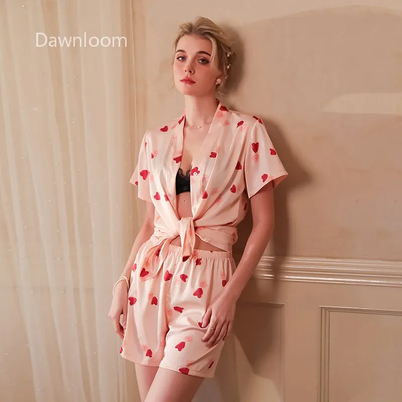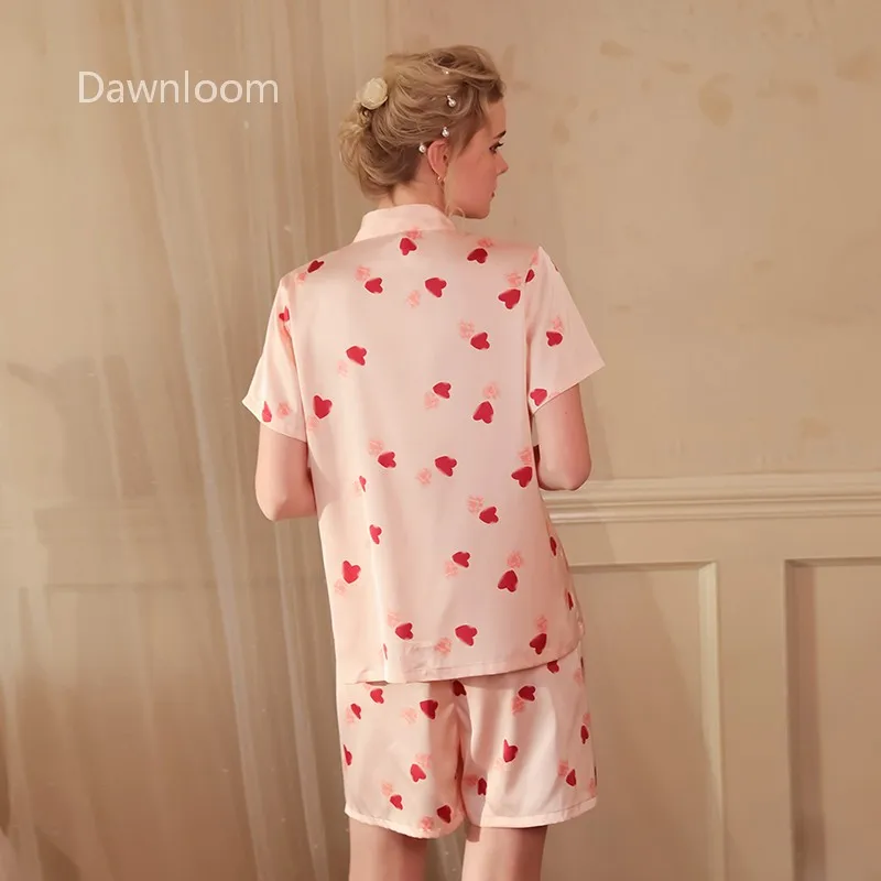 The light pink base is gentle and fresh, paired with red heart prints for a sweet, vibrant vibe; the shirt collar + short-sleeve & shorts silhouette is refreshing and suitable for summer wear, and the satin material shows delicate luster, radiating delicate texture even in relaxed home settings.